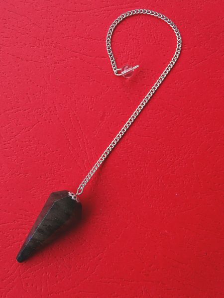 Visak napravljen od labradorita veličine 40x17 mm zakačenog na posrebreni lančić dužine 15 cm.