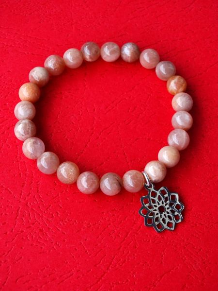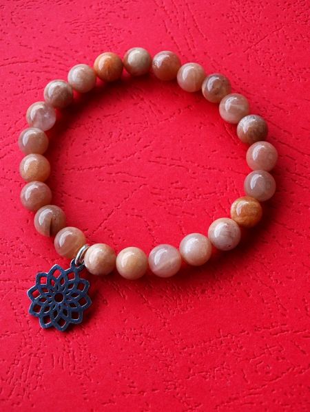 Đapa mala od sunčevog kamena s priveskom mandala od nerđajućeg čelika. Narandžasto-smeđa sa sedefastim odsjajem.