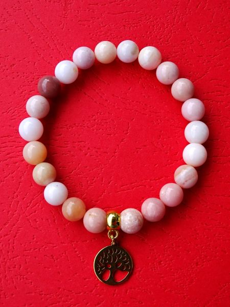 Đapa mala od opala. Ružičasto-smeđe-bela. Privezak drvo života od nerđajućeg čelika zlatne boje.